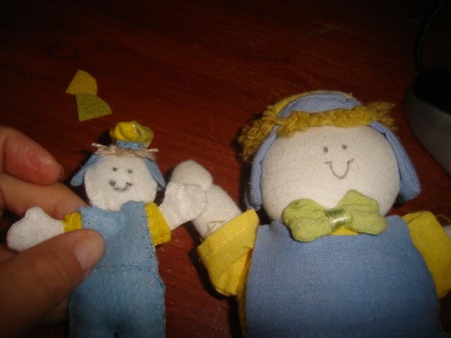 Aqui está a comparação. Fiquei satisfeita com o resultado. Ah! A gravatinha fiz um retângulo de feltro e apertei no meio com linha para bordar na mesma cor e esqueci de falar e de fotografar os sapatinhos: eu fiz um fuxico fechei e ajustei em volta dos moldes das perninhas...